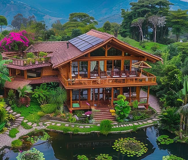 Throughout the interior, eco-friendly materials like reclaimed wood, bamboo flooring, and recycled glass countertops create a luxurious yet sustainable ambiance.
